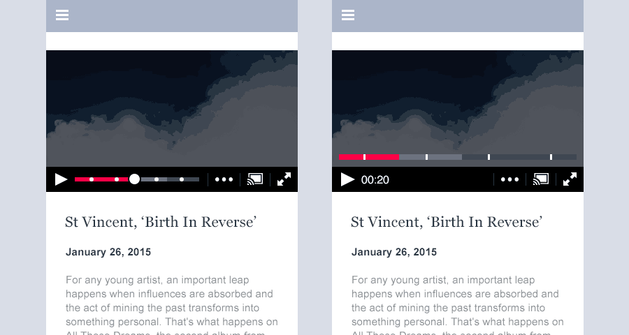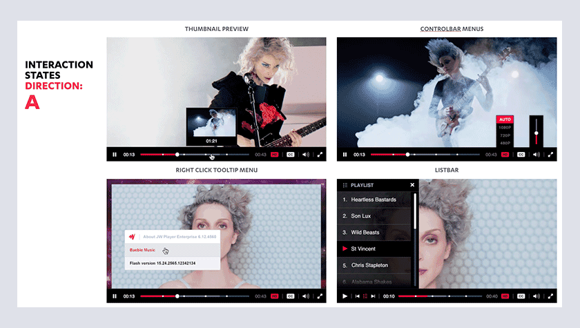 After we felt confident we had two solid directions to pursue, and that each could be customized easily to ensure a fully branded experience, we moved to the next phase: how each design would play out in the context of our player interactions and features. The goal here was to ensure our skin could behave organically and adjust fluidly to different configuration settings and user interactions. Could we solve for certain interactions easily or would it further complicate the engineering of the player? Of course we could design and build it any way we conceived but was that the most valuable approach for our users?